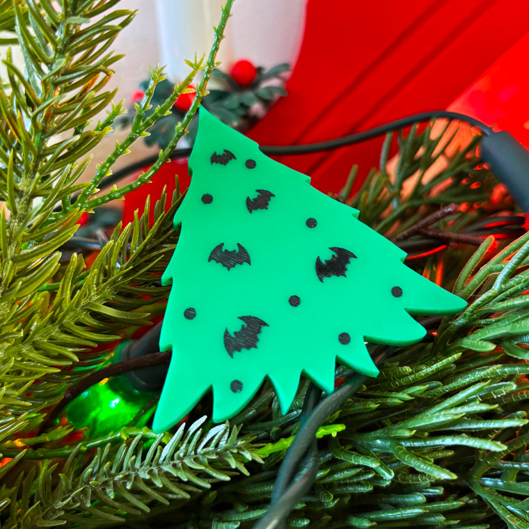 This brooch has has a makeover compared to 2024's tree brooch. This years tree is once again made from Acrylic and this time features engraved bats and baubles, which have been hand painted black. It's lighter and slimmer that last years brooch too!