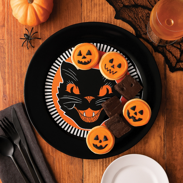This vintage Halloween plate from Beistle is made from polypropylene plastic and features a vintage black cat design.